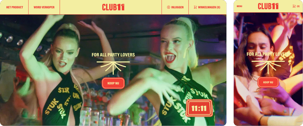 CLUB 11 was created as the official shots brand of StukTV, developed to bring their iconic ritual to the wider nightlife scene. The goal was to introduce a completely new low-alcohol shots brand to the Dutch market — not only for existing fans, but for anyone 18+ enjoying nights out in bars, clubs, festivals and parties. The brand needed a digital home that felt loud, energetic and ready to make a statement.